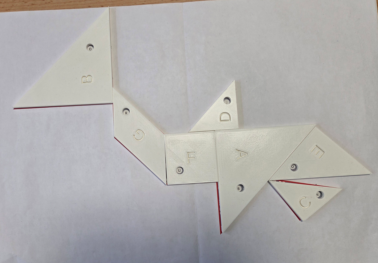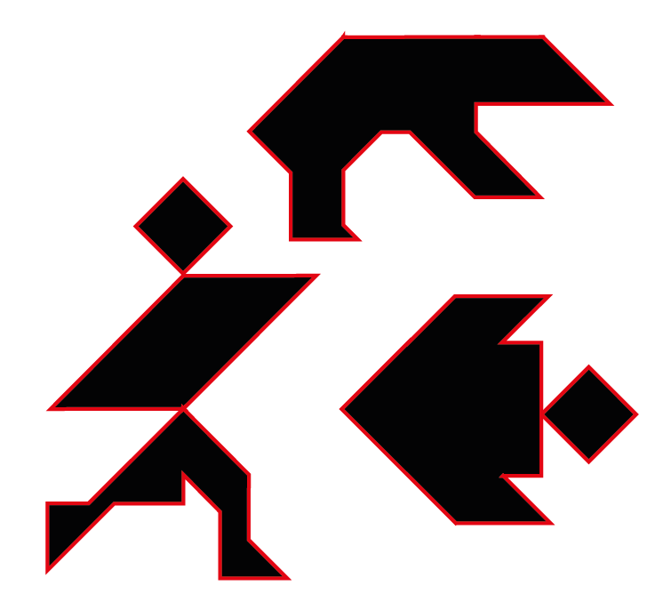 Nos énigmes ont aussi avancé. Concernant l’énigme du tangram, les joueurs disposeraient de 3 jeux de 7 pièces de tangram (plus petites que celles dont nous disposons actuellement pour que tout puisse rentrer dans un compartiment de la boîte) (figure 4) et de 3 figures à reproduire (un ours, un humain et un poisson, qui sont liés à des éléments importants de l’histoire) (figure 3).